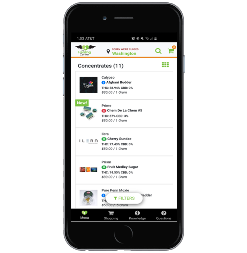 The app and online menu include an easy way for customers or patients to filter products. The floating filter button can allow multiple filters to be selected to help customers narrow down the products your dispensary has available.