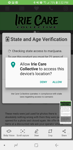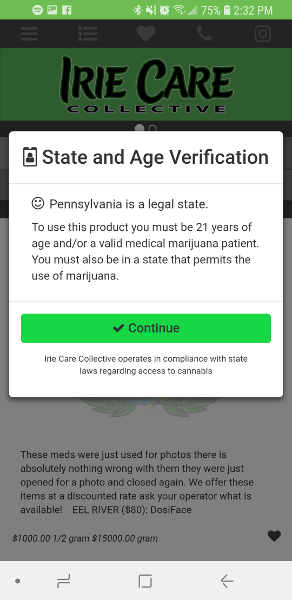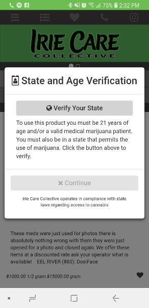 The state and age verification service can help ensure that the customers using the app are within compliance of state laws. Once a customer downloads the app and opens it for the first time they will be presented with a dialog asking to verify their state. Pressing this button will run a process of looking up a user's location and verifying they're within a state that allows the use of marijuana. Apple users have no choice but to use their location service to verify, so this must be turned on in order to use the app.